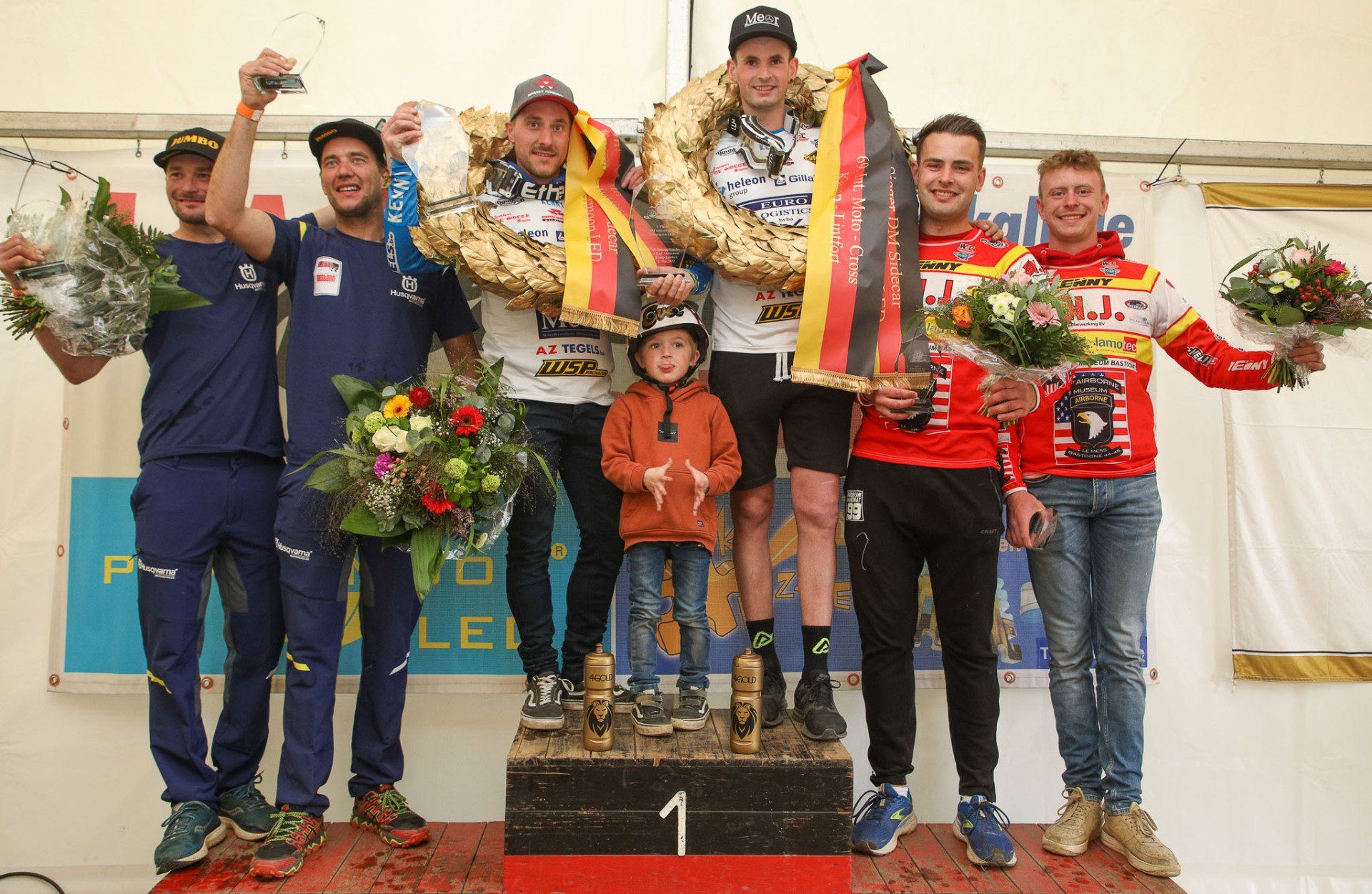 Das Podium vom 1. Lauf zum Seitenwagen-Veteranen-Cup 2022, von links: Christian Köhler/Johnas Diehm DEU/DEU (4.), Alexander Seubert/Torsten Seubert, DEU/DEU (2.), Dietmar Schnid/Bruno Kälin, DEU/CHE (1.), fehlen, Volker Barrabas/Moritz Barrabas, DEU/DEU (3.), Ullrich Keller/Uli Junginger DEU/DEU (5.)